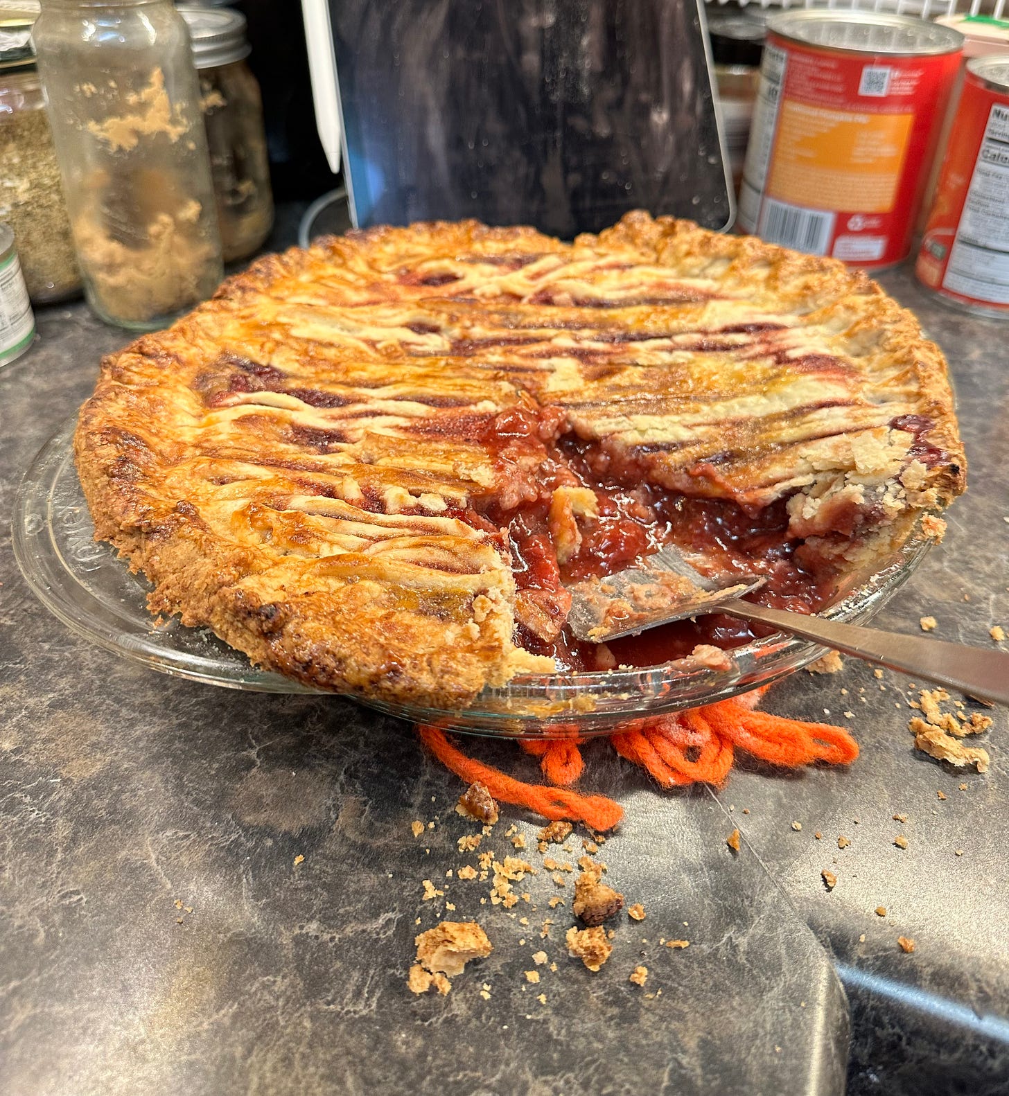 It’s like a strawberry pie from a baker whose never made a strawberry pie. I’m putting here a chapter from my book. The pie, though rough-and-ready looking (see pic below) eats tremendously well. Good enough to serve at a Sit-Down with Father Logos. I dunno. You be the judge.