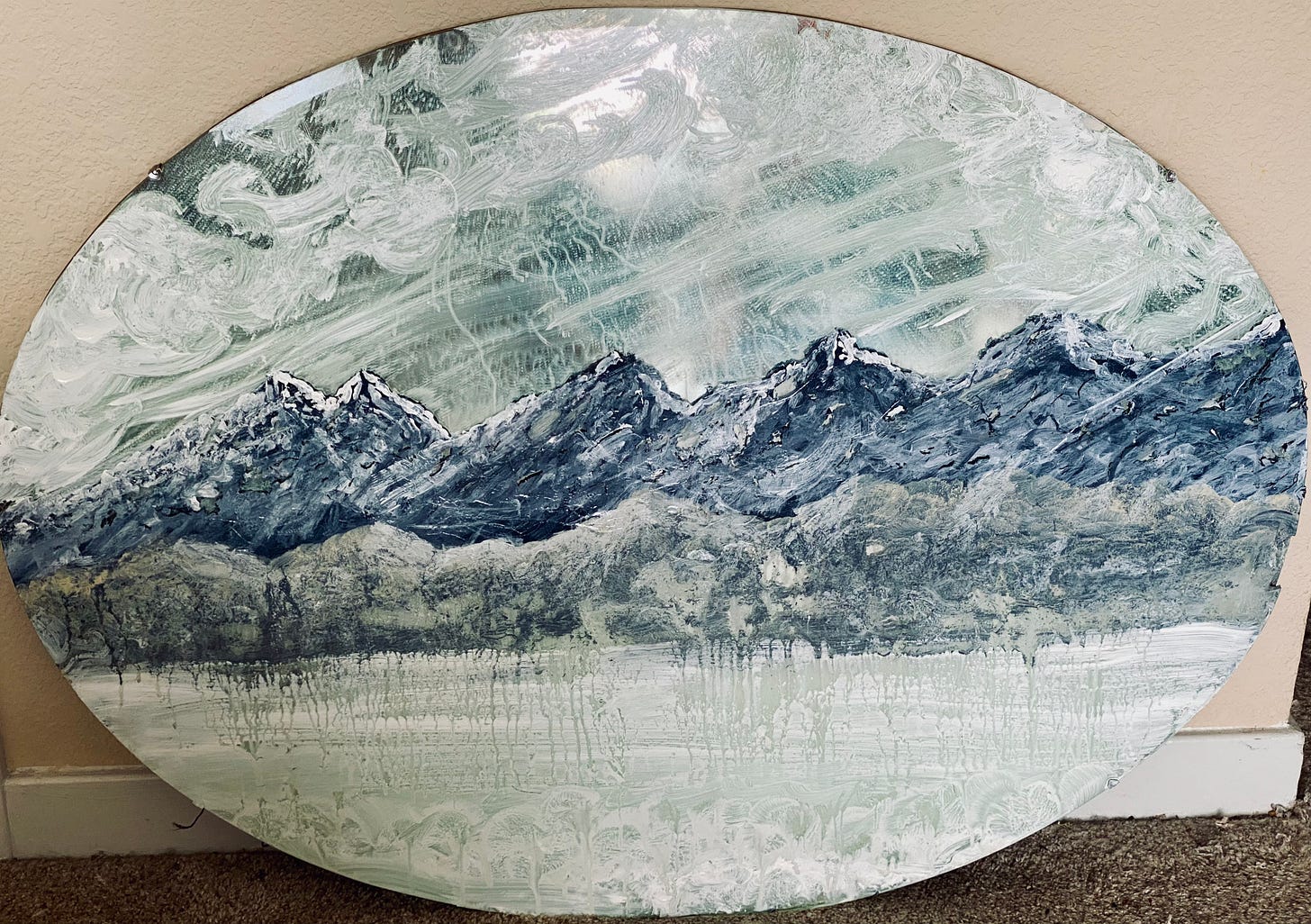 About six months ago, I found this mirror in the fourth-floor elevator lobby. Gang, it was HU-YUGE! And a little chipped. I promptly stored it in my bedroom/artist loft. Then I let it marinate in my thoughts. I mean, it wasn’t going anywhere. I saw it everyday in the bedroom, when I woke, when I went to sleep.